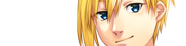 容姿:もみあげが向かって右は耳が見える程度、左は丁度顎あたりまで伸びた金髪。後ろは頭の形が分かる程度。青いサファイアのような釣り気味の瞳。