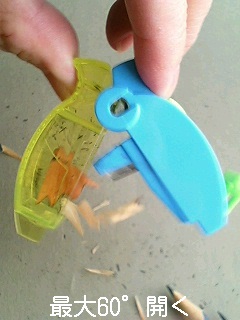 上部をつまんで、黄緑色の削りくず受けをかぱっと開けることができ、カバーを失くすことがないのです。